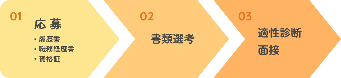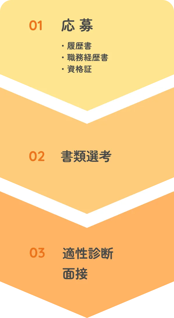 履歴書、職務経歴書、資格証写しをご送付ください。